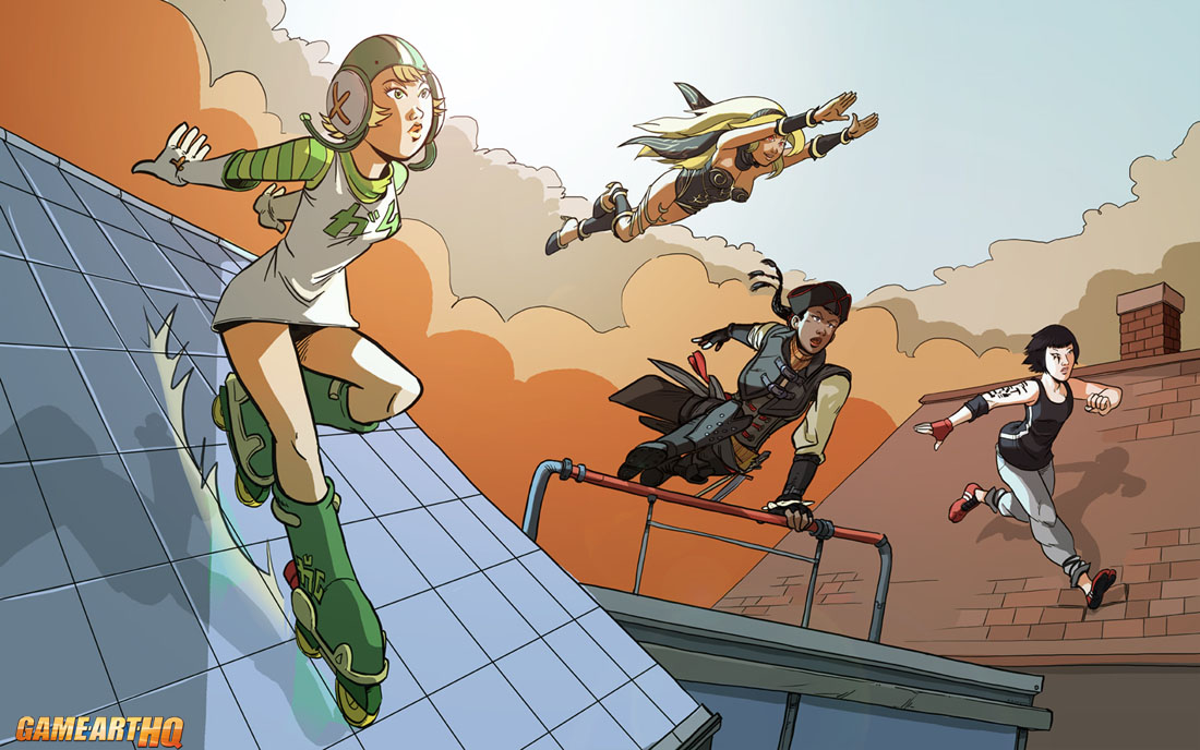 Sometimes we, the gamers bring games and their characters together via our art while they would never be in a real crossover game. Here you have Faith Connors from Mirror’s Edge as example..Gum from Jet Set Radio, Kat from Gravity Rush and Aveline from Assassin’s Creed. These characters have barely anything in common, beside all being damn cool in their games 🙂